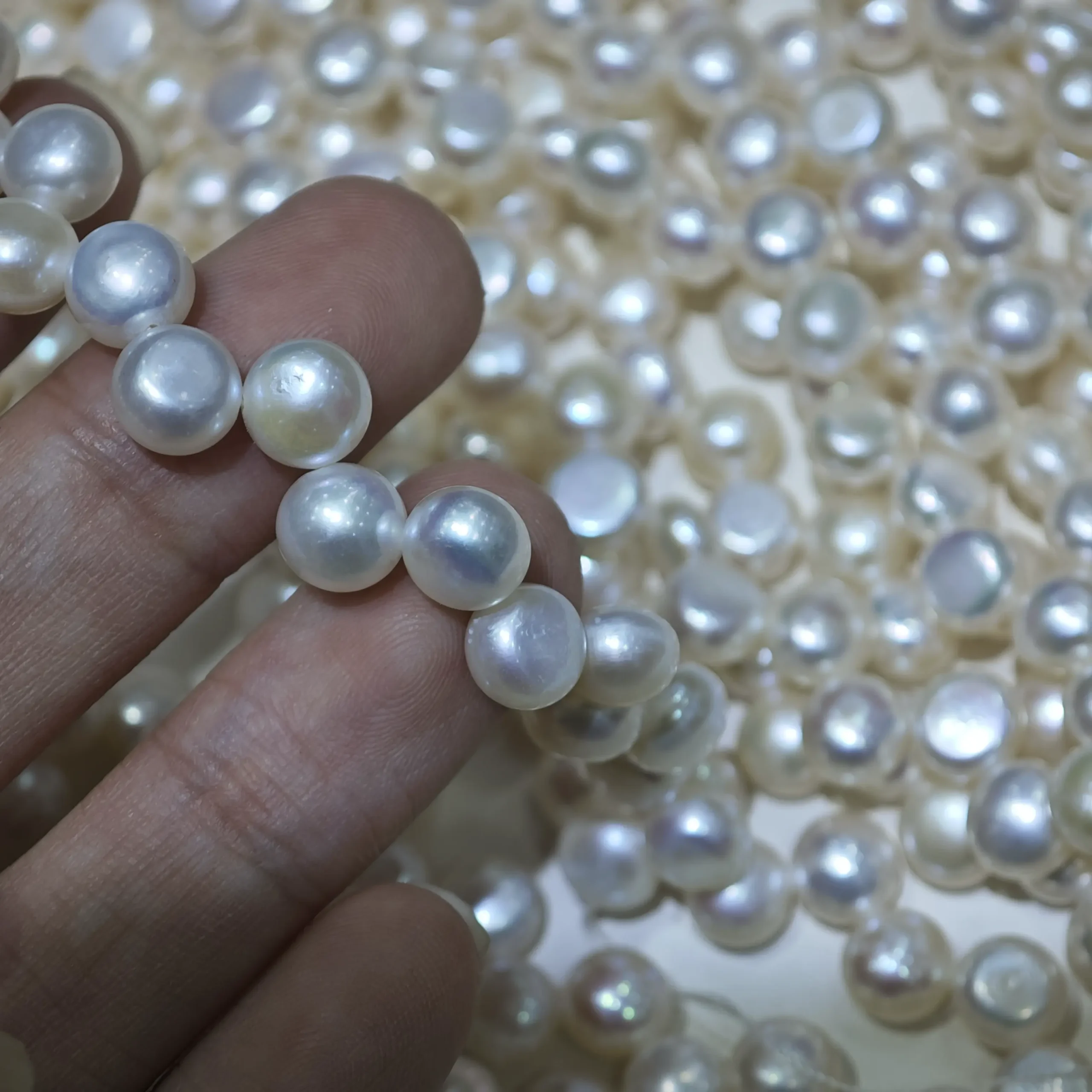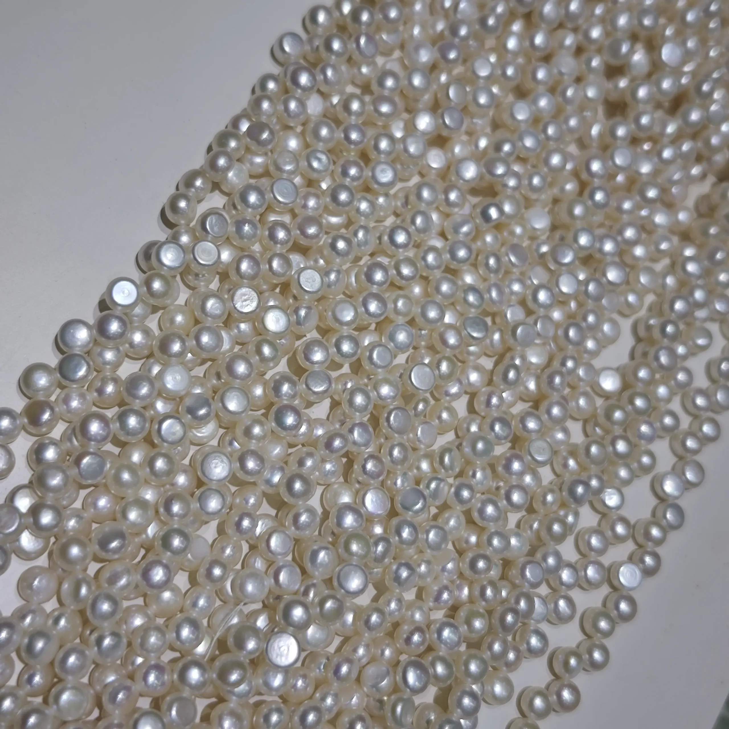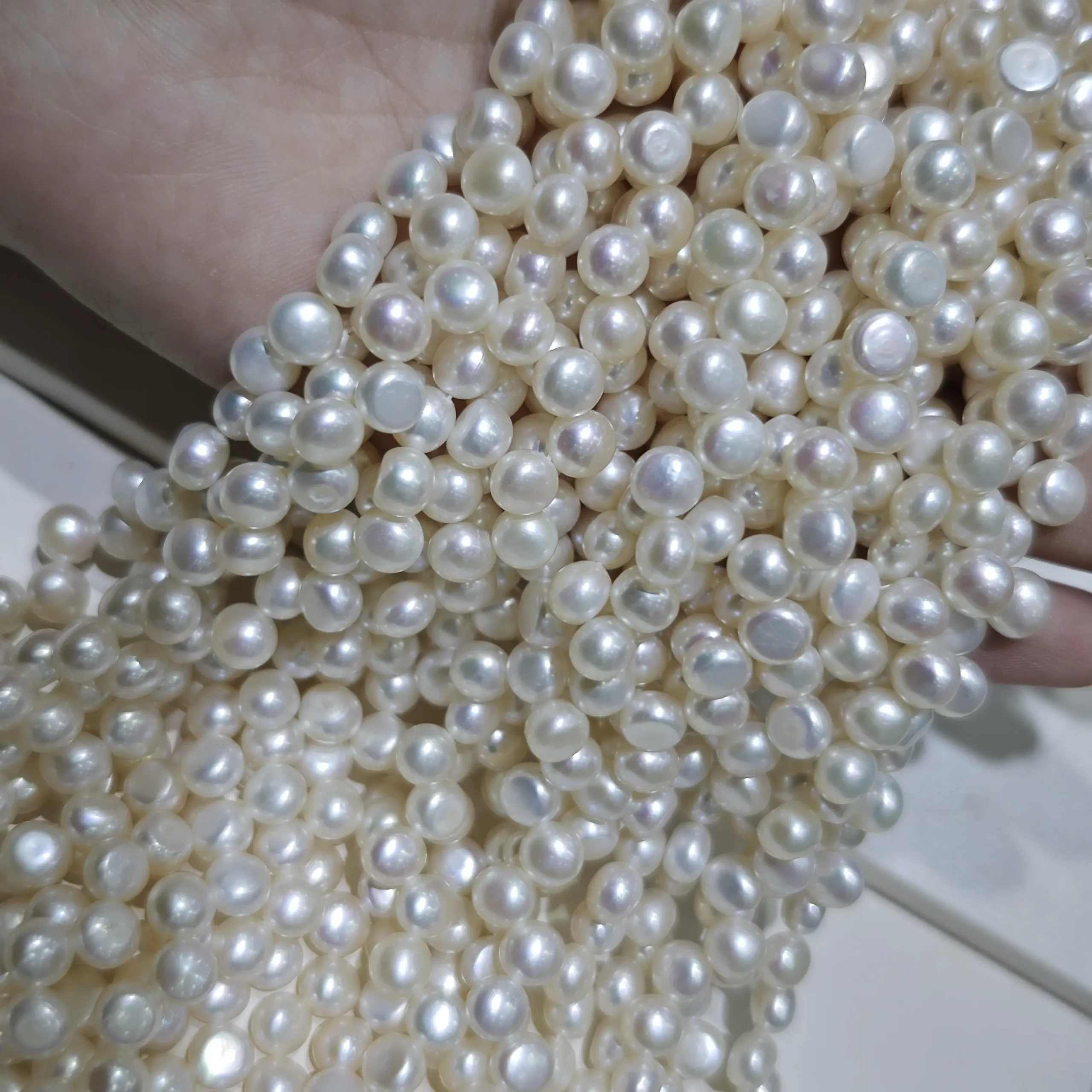 La elegante forma de botón da un toque moderno a los diseños clásicos de perlas. Se apoya plana contra la muñeca o el escote para un uso cómodo diario. La calidad AAA de nivel medio mantiene los costos controlados, ofreciendo aún así la superficie luminosa que los clientes esperan de perlas de agua dulce genuinas, haciendo que el collar sea ideal para crear pulseras y collares de perlas modernos que fotografían maravillosamente y se venden a precios atractivos.